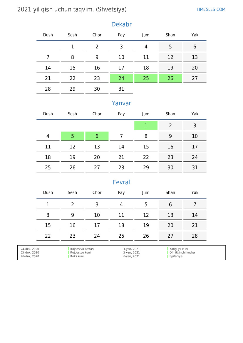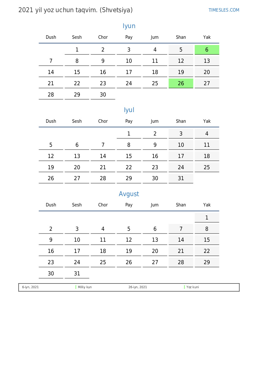 Shvetsiya uchun 2021 yilgi yoz uchun taqvim