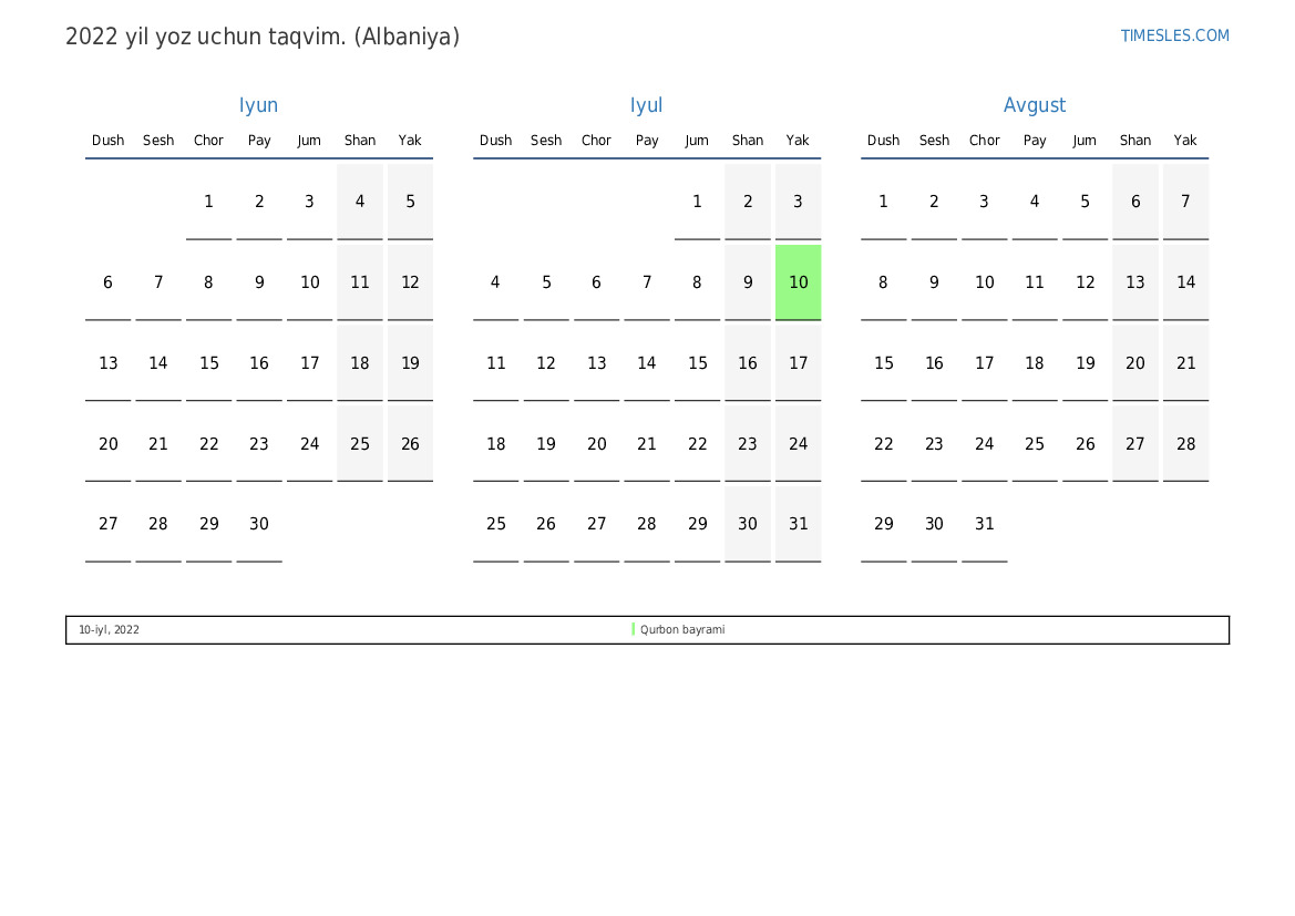 Albaniya uchun 2022 yil yoz uchun ta'til va dam olish kunlari taqvimi