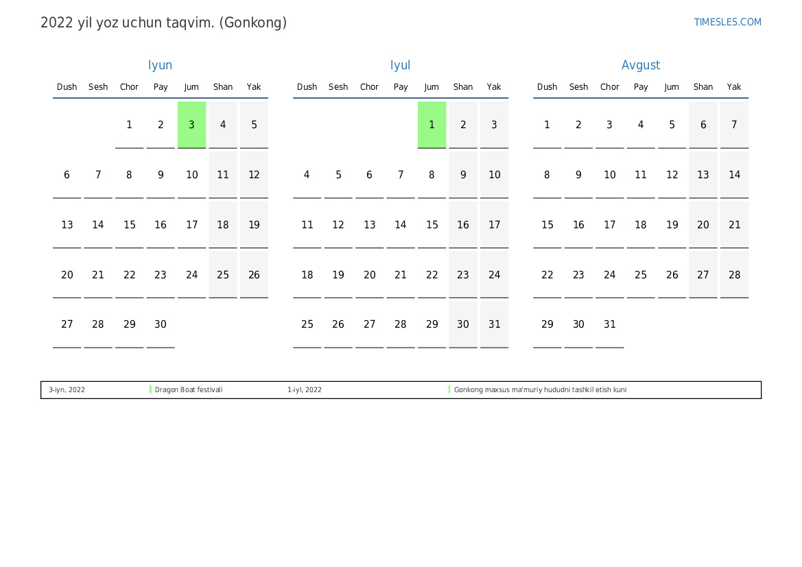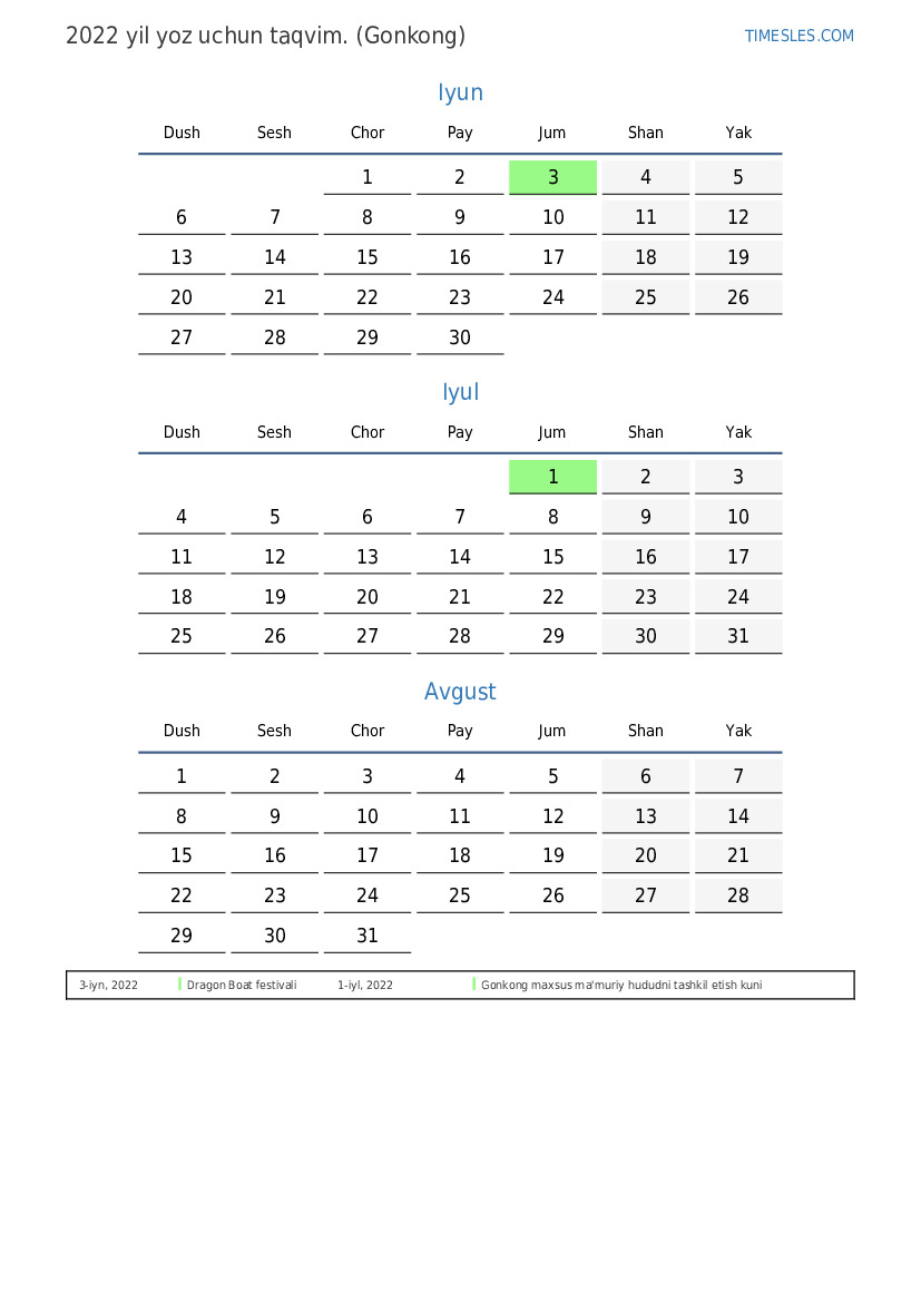Gonkong uchun 2022 yilgi yoz uchun taqvim