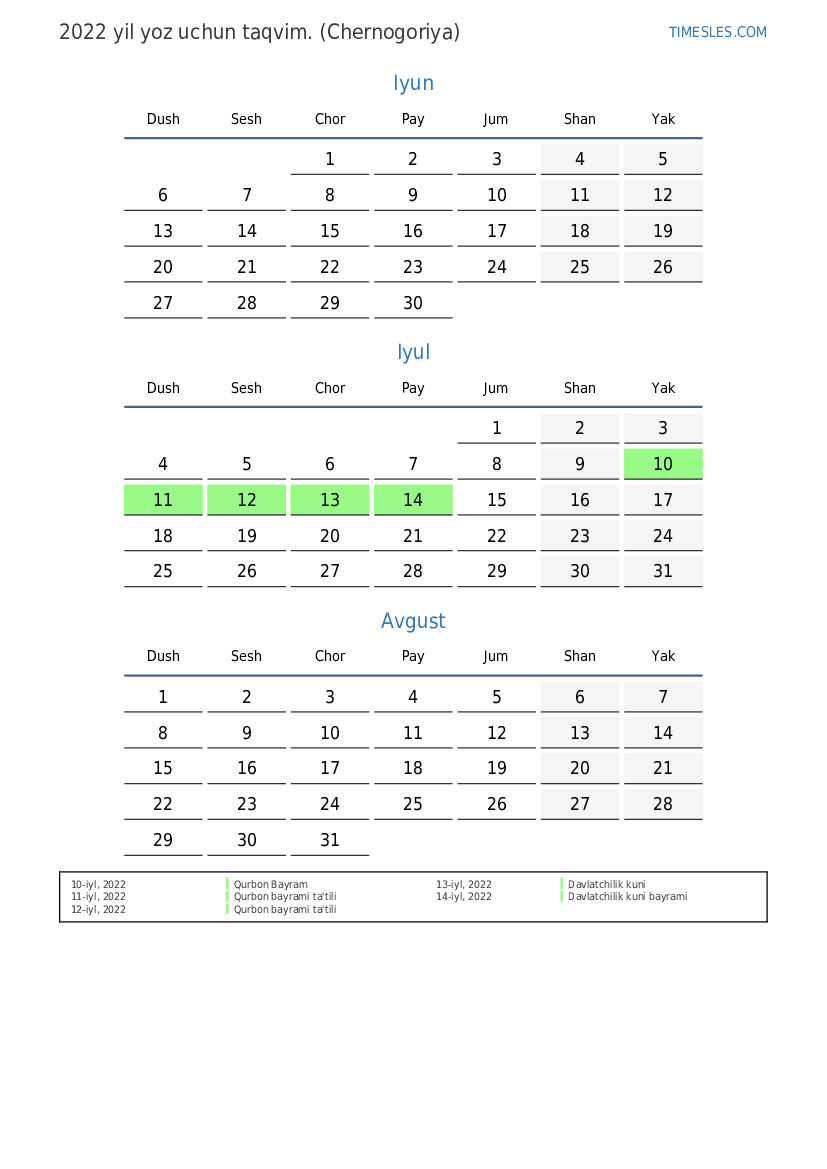 Chernogoriya uchun 2022 yilgi yoz uchun taqvim