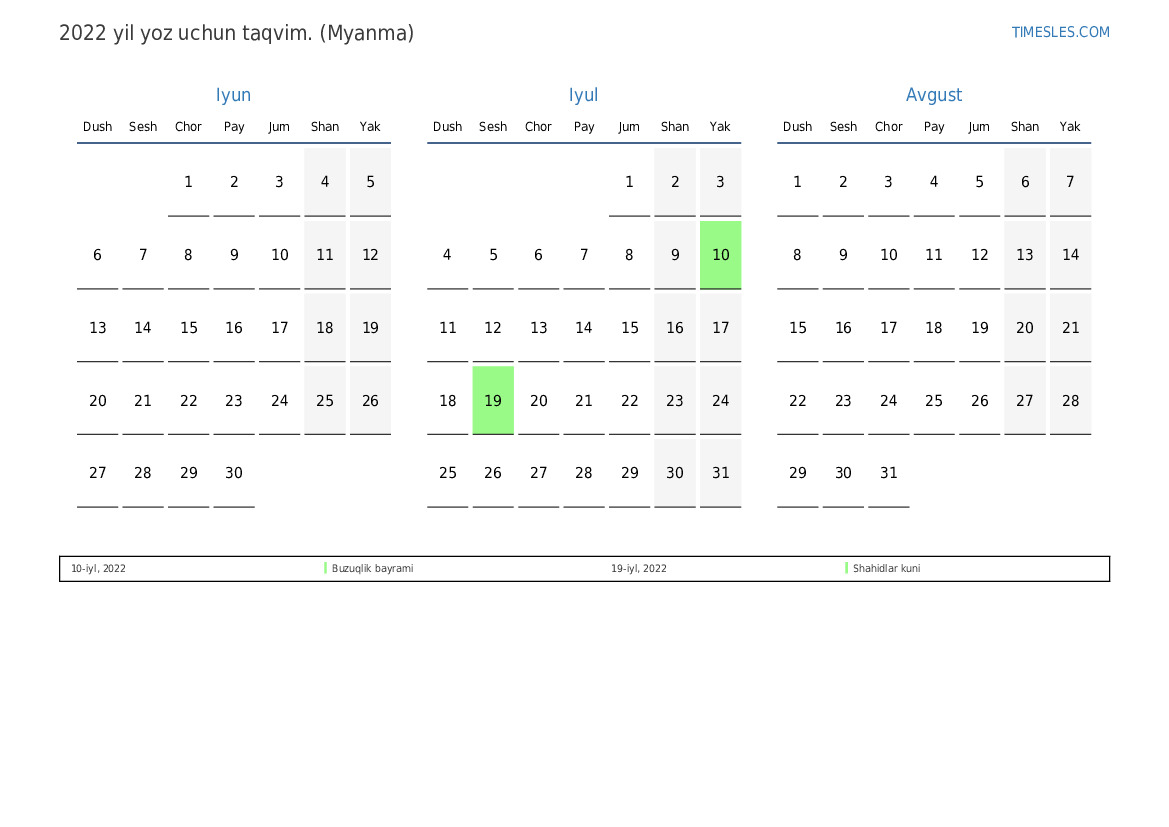 Myanma uchun 2022 yil yoz uchun ta'til va dam olish kunlari bilan PDF taqvimini yuklab oling va chop eting