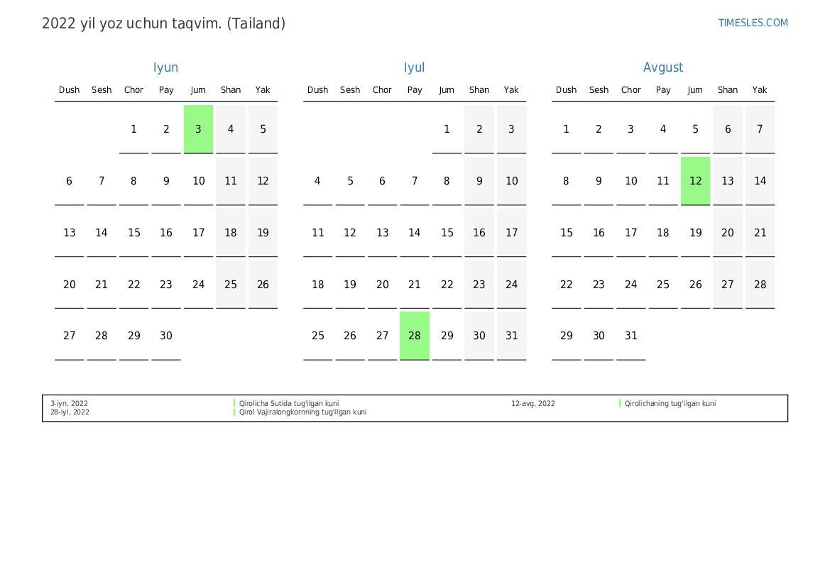 Tailand uchun 2022 yilgi yoz uchun taqvim