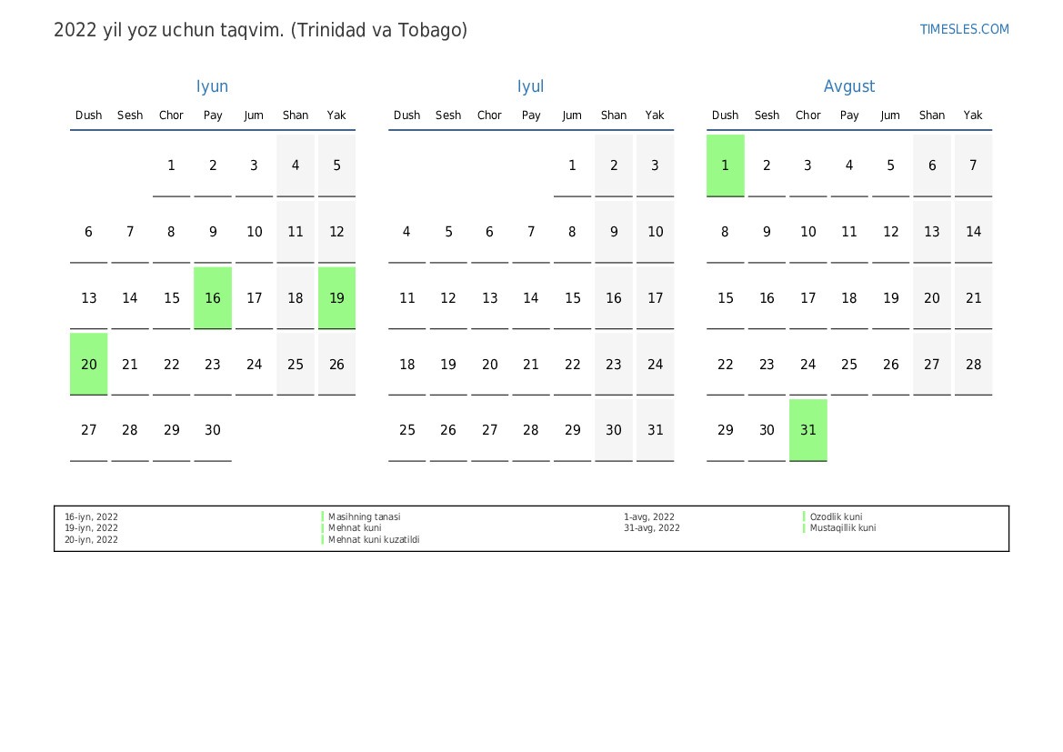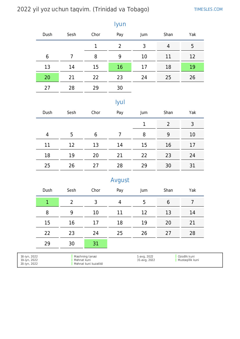 Trinidad va Tobago uchun 2022 yil yoz uchun ta'til va dam olish kunlari taqvimi