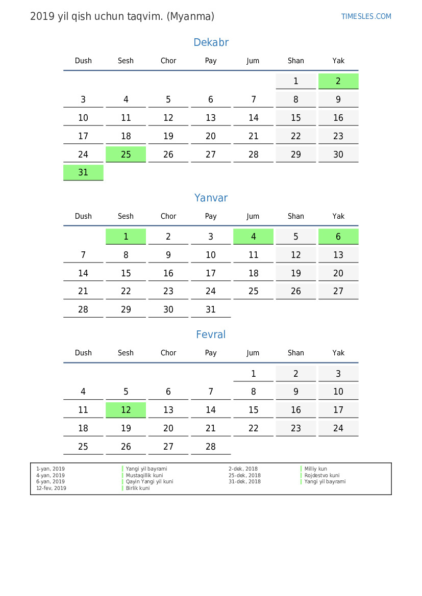 Myanma uchun 2019 yil qish uchun ta'til va dam olish kunlari bilan PDF taqvimini yuklab oling va chop eting
