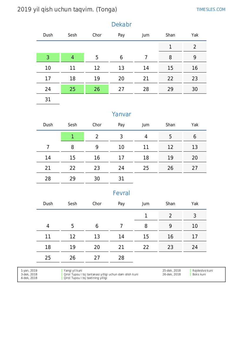 Tonga uchun 2019 yil qish uchun ta'til va dam olish kunlari taqvimi