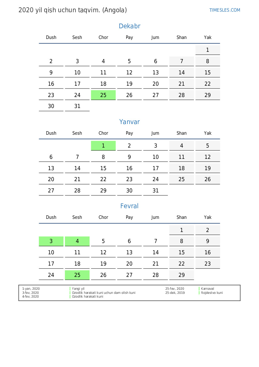 Angola uchun 2020 yil qish uchun ta'til va dam olish kunlari bilan PDF taqvimini yuklab oling va chop eting