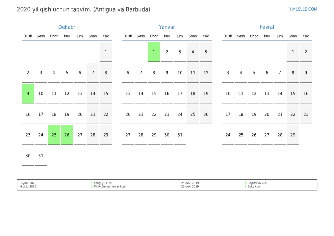 Antigua va Barbuda uchun 2020 yilgi qish uchun taqvim