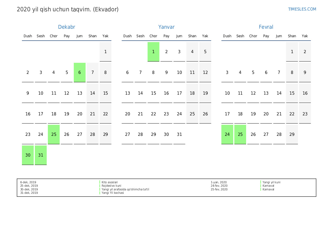 Ekvador uchun 2020 yil qish uchun ta'til va dam olish kunlari taqvimi