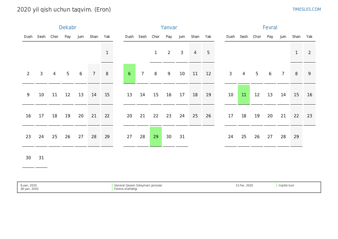 Eron uchun 2020 yilgi qish uchun taqvim