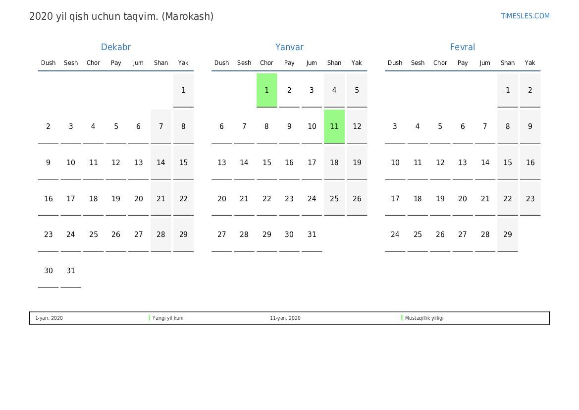 Marokash uchun 2020 yil qish uchun ta'til va dam olish kunlari taqvimi