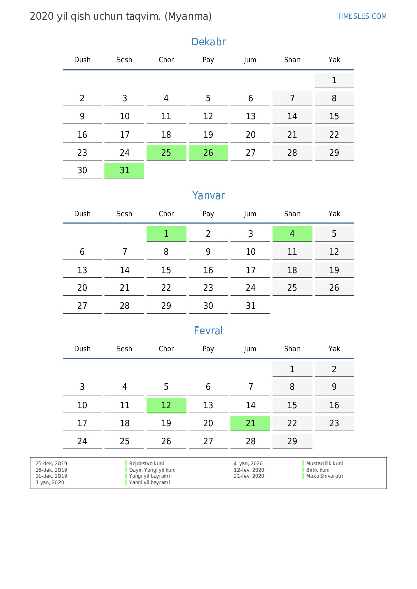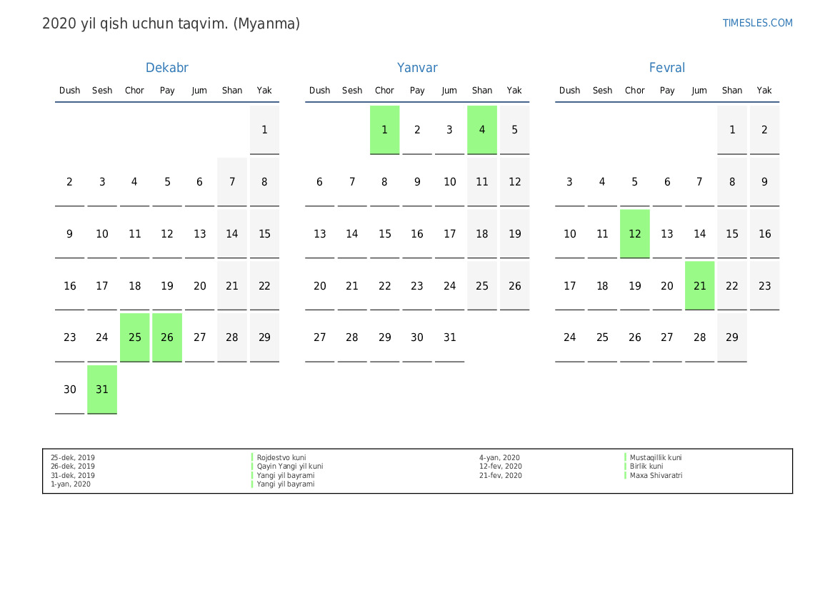Myanma uchun 2020 yil qish uchun ta'til va dam olish kunlari bilan PDF taqvimini yuklab oling va chop eting