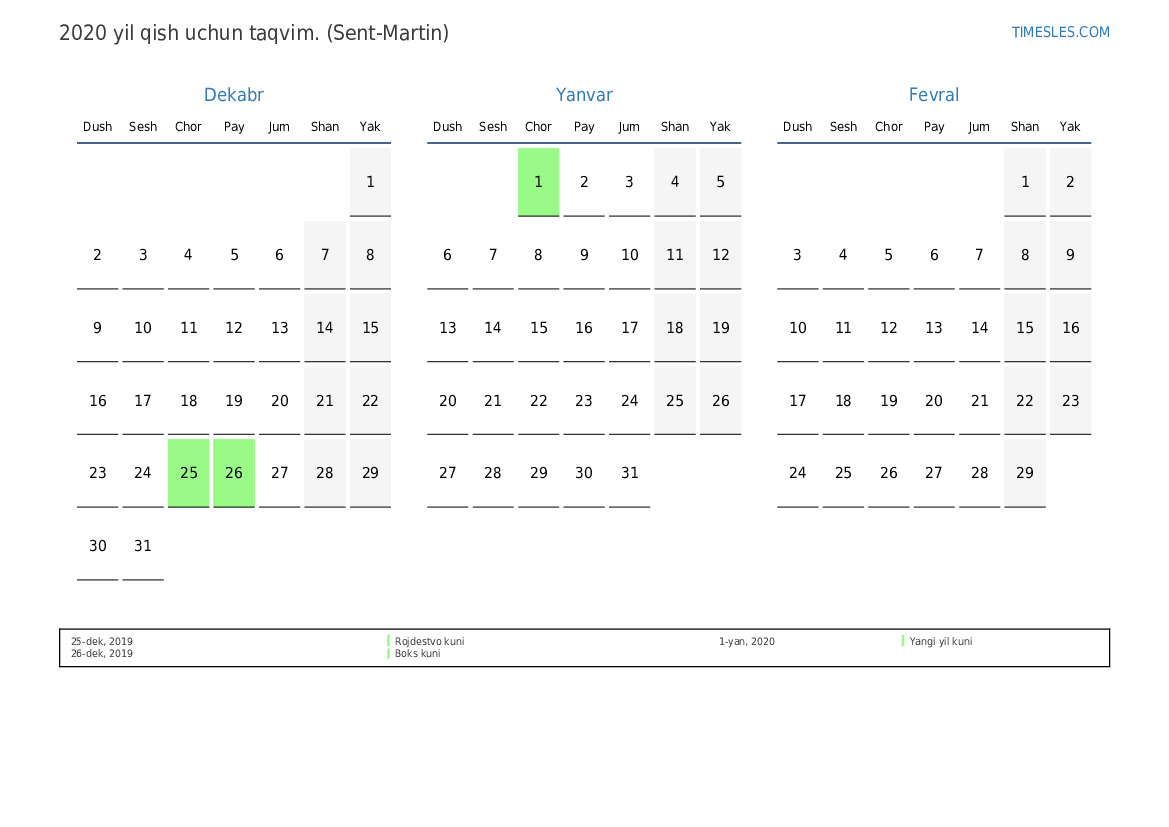 Sint Marten uchun 2020 yilgi qish uchun taqvim