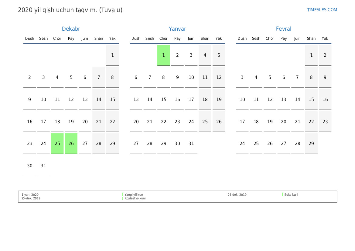 Tuvalu uchun 2020 yil qish uchun ta'til va dam olish kunlari bilan PDF taqvimini yuklab oling va chop eting