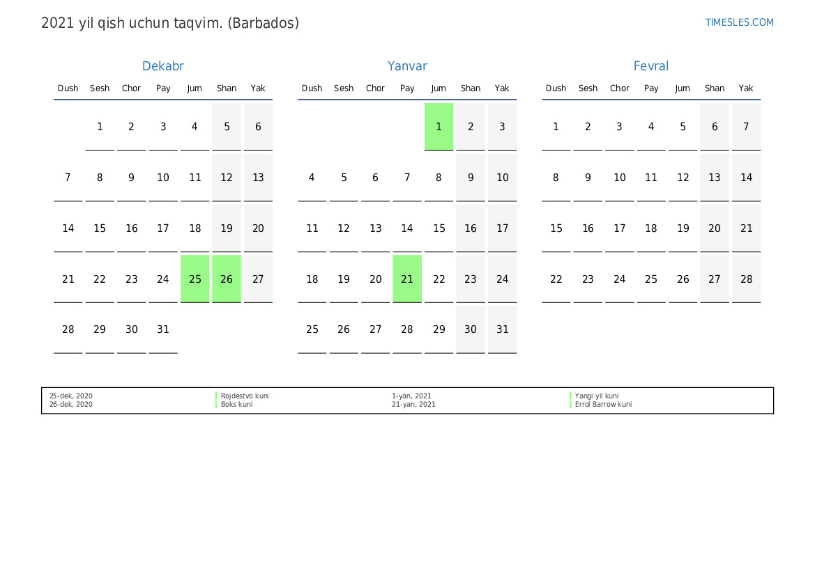 Barbados uchun 2021 yil qish uchun ta'til va dam olish kunlari taqvimi