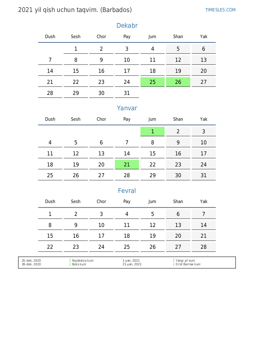 Barbados uchun 2021 yilgi qish uchun taqvim