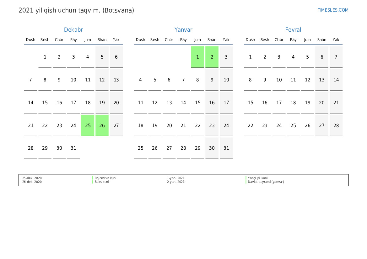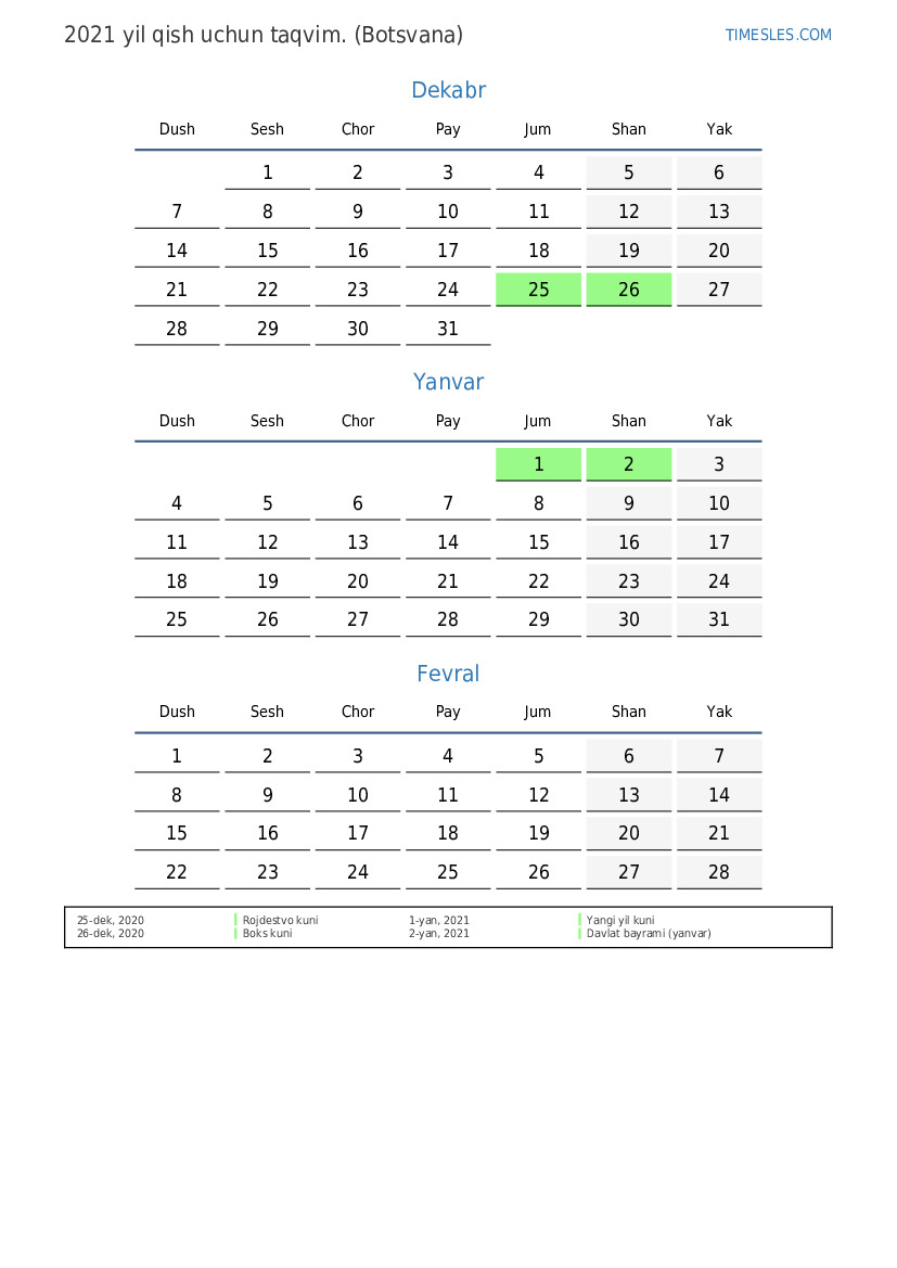 Botsvana uchun 2021 yilgi qish uchun taqvim