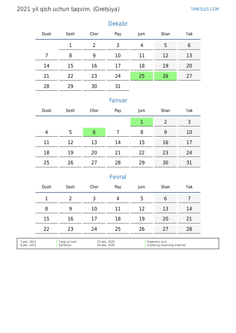 Gretsiya uchun 2021 yilgi qish uchun taqvim