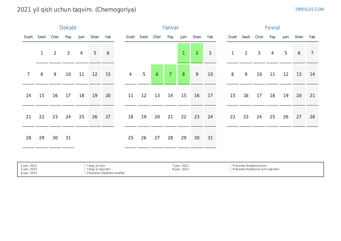 Chernogoriya uchun 2021 yil qish uchun ta'til va dam olish kunlari taqvimi