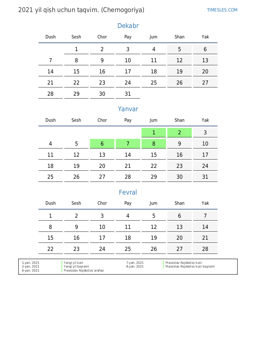 Chernogoriya uchun 2021 yilgi qish uchun taqvim