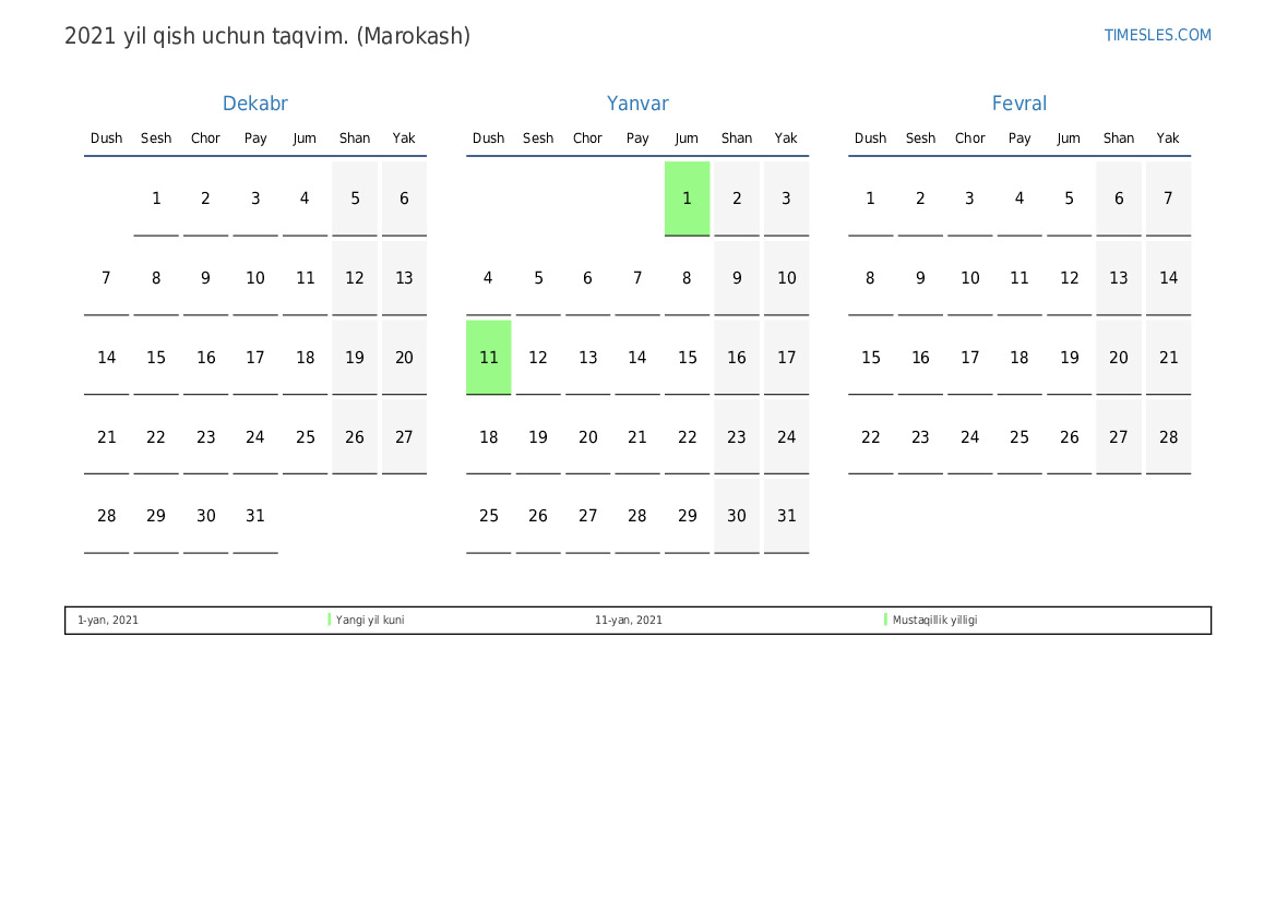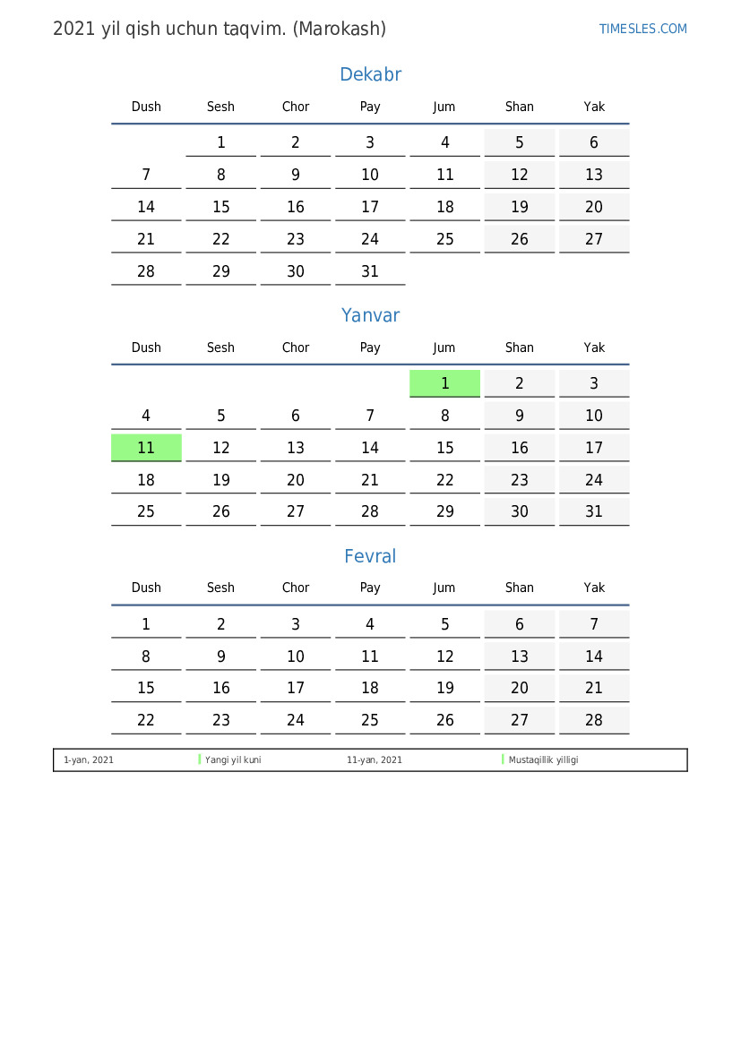 Marokash uchun 2021 yil qish uchun ta'til va dam olish kunlari taqvimi