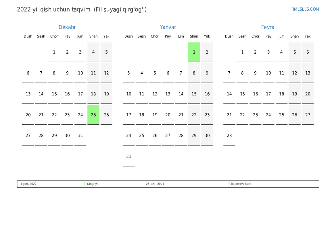 Kot-d'Ivuar uchun 2022 yil qish uchun ta'til va dam olish kunlari bilan PDF taqvimini yuklab oling va chop eting