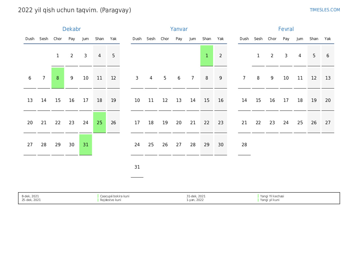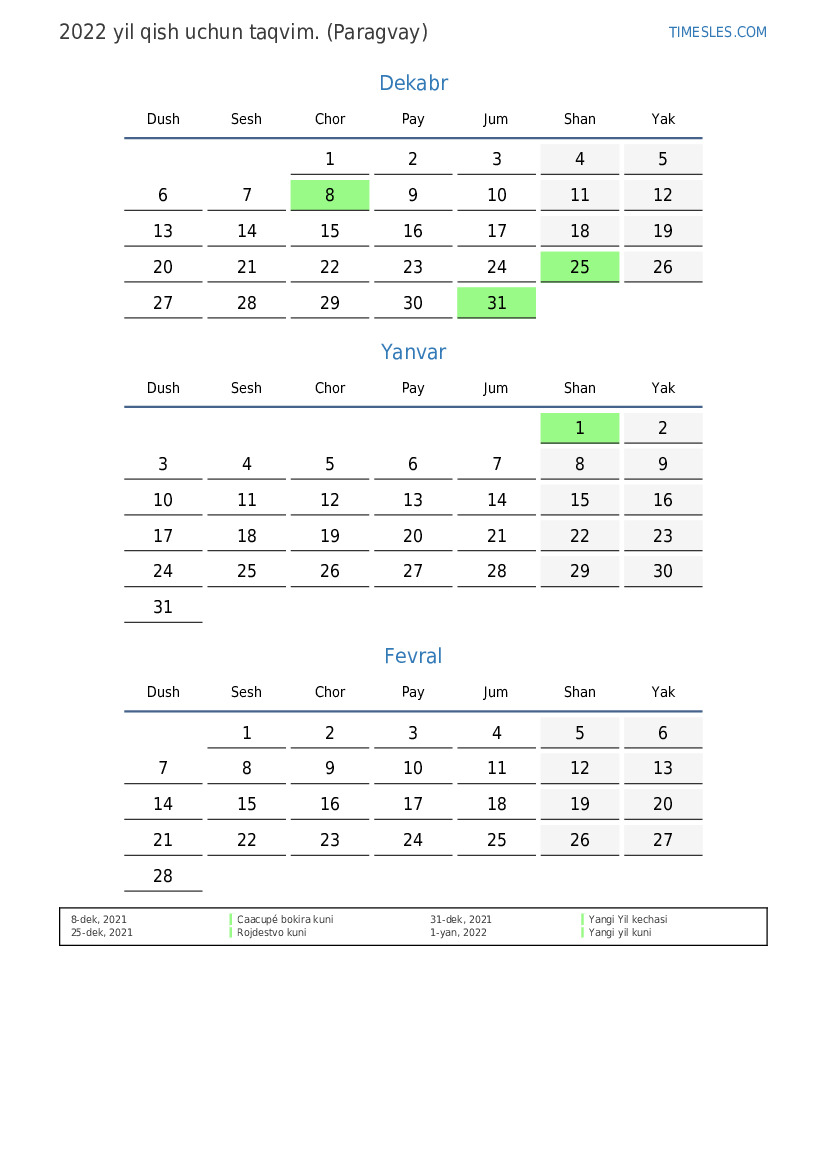 Paragvay uchun 2022 yil qish uchun ta'til va dam olish kunlari taqvimi