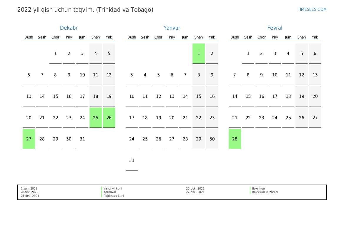 Trinidad va Tobago uchun 2022 yil qish uchun ta'til va dam olish kunlari bilan PDF taqvimini yuklab oling va chop eting