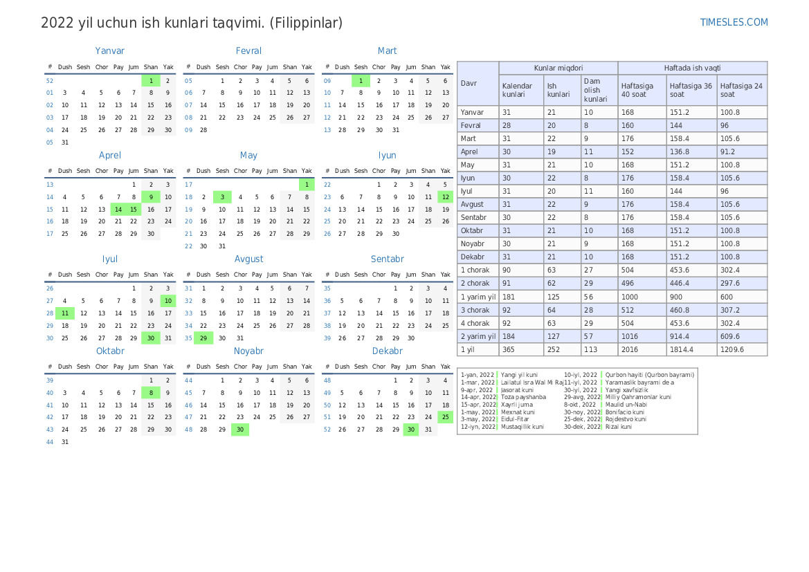 Filippin uchun Yanvar 2022 uchun ish kuni