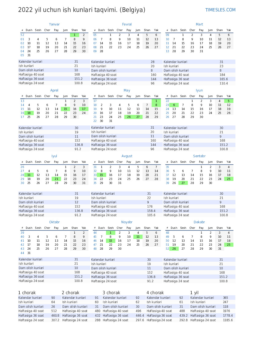 Belgiya uchun 2022 yil May uchun ish kunlari taqvimi