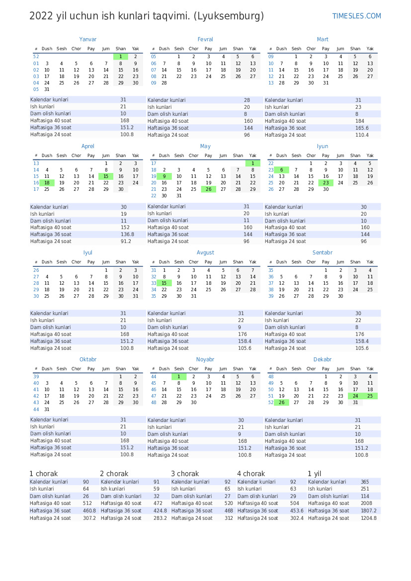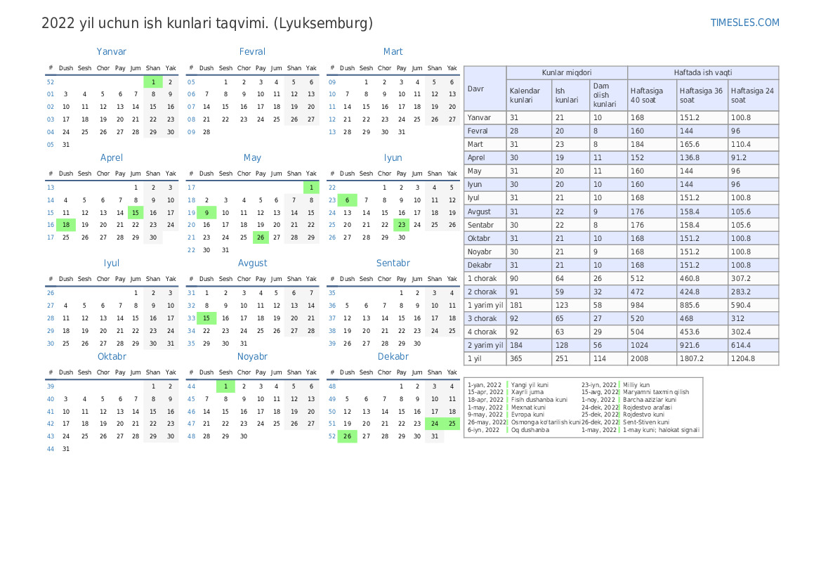 Lyuksemburg uchun Iyun 2022 uchun ish kuni