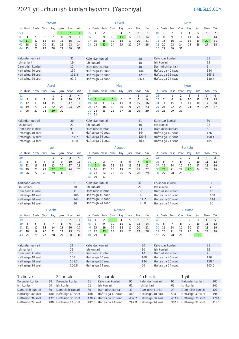 | Haftasiga 40 soat | 480 |