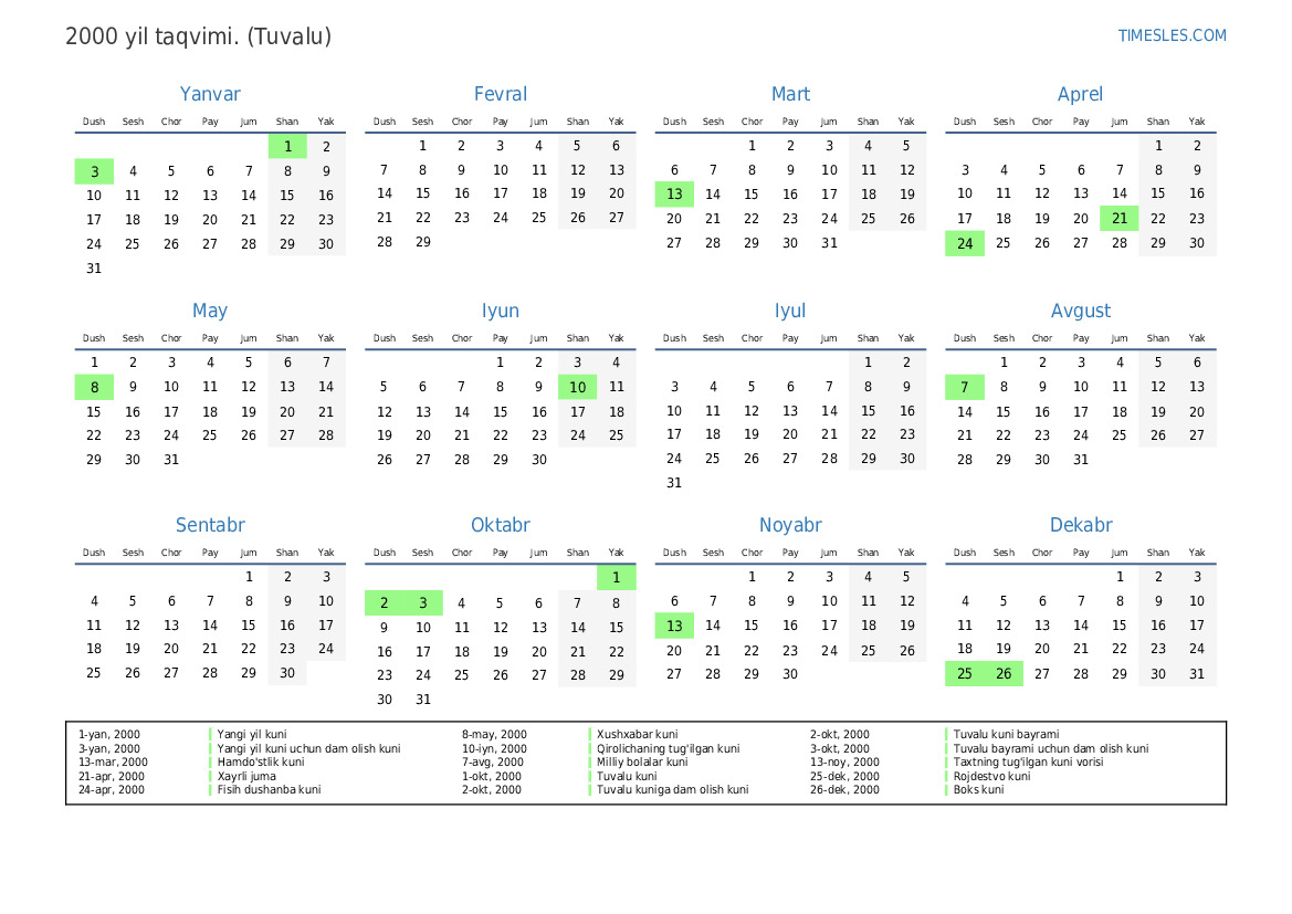 2-okt, 2000 Tuvalu kuniga dam olish kuni