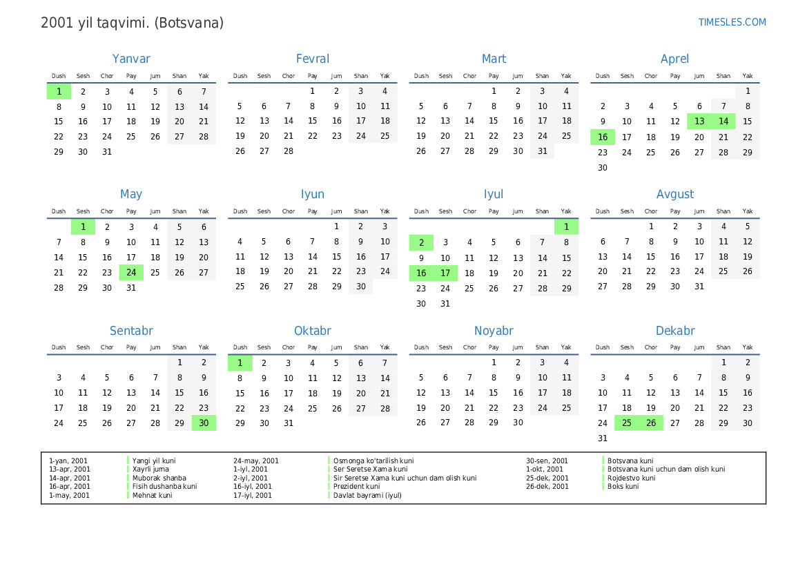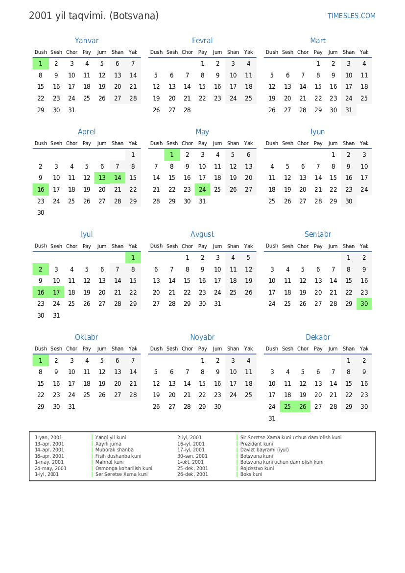 1-okt, 2001 Botsvana kuni uchun dam olish kuni