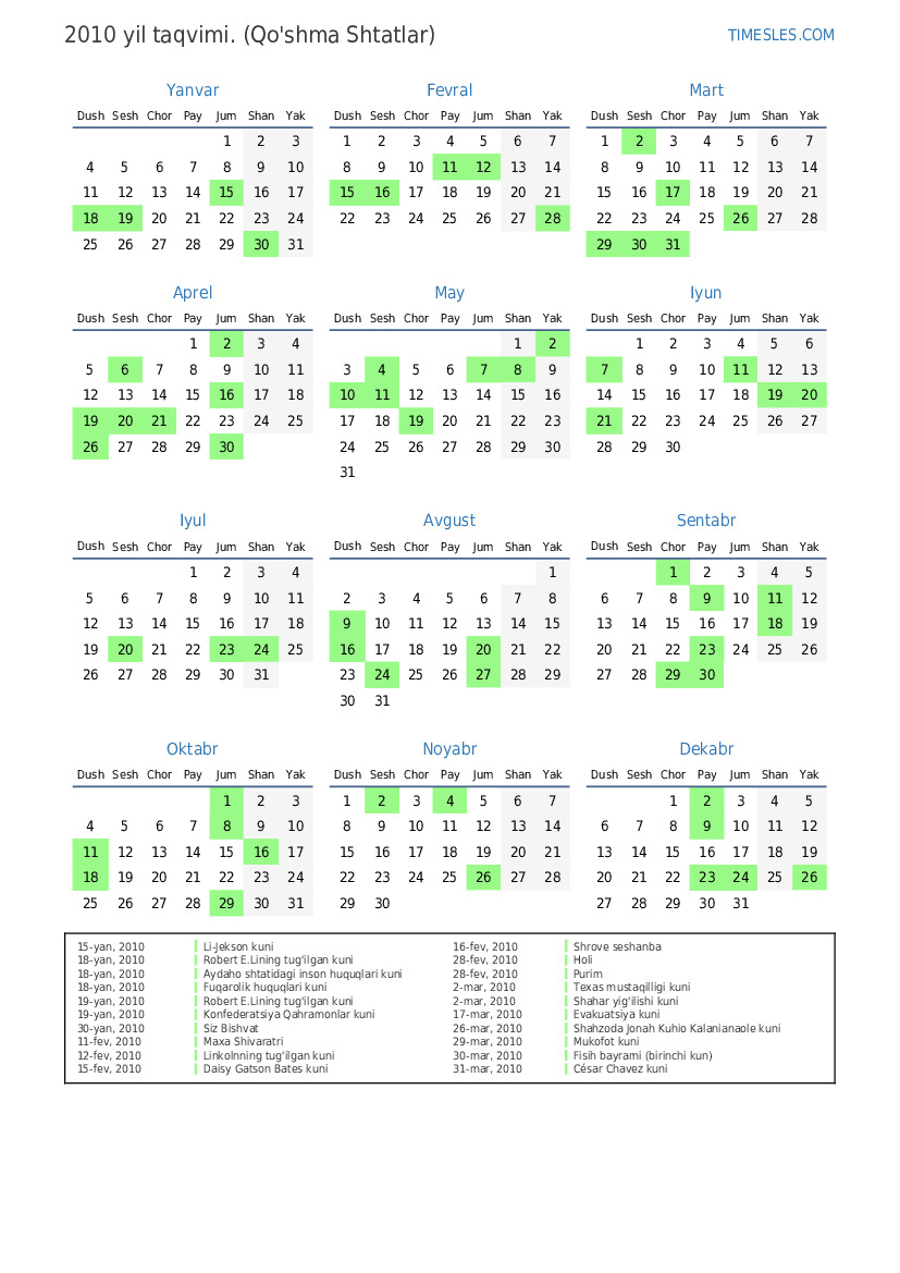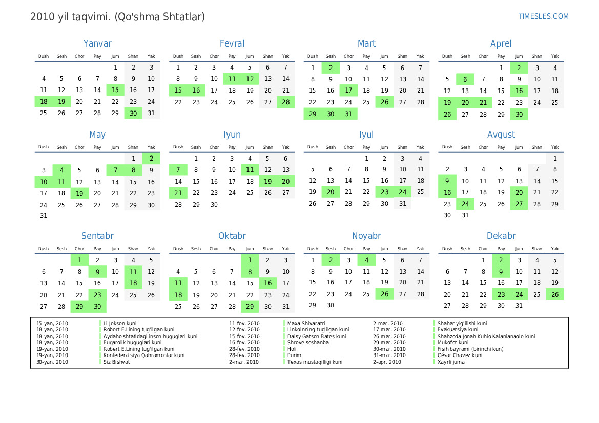31-dek, 2010 Yangi yil kuni uchun dam olish kuni