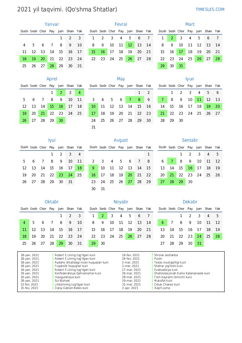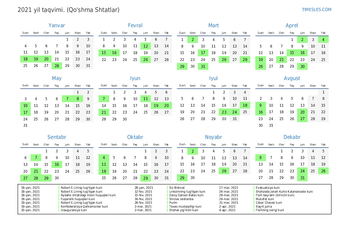 31-dek, 2021 Yangi yil kuni uchun dam olish kuni