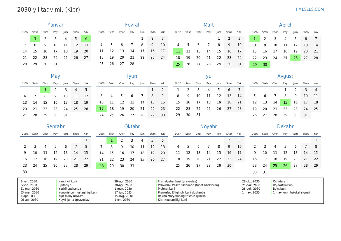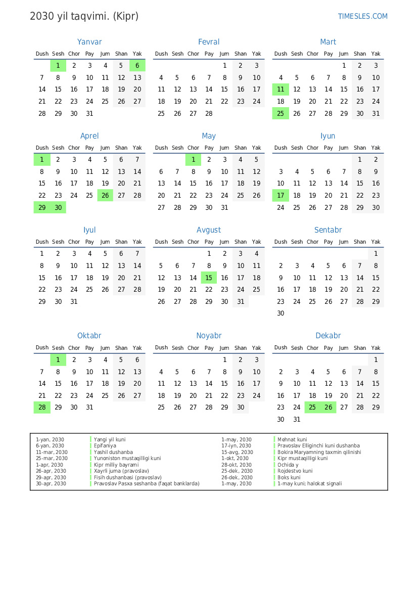 30-apr, 2030 Pravoslav Pasxa seshanba (faqat banklarda)