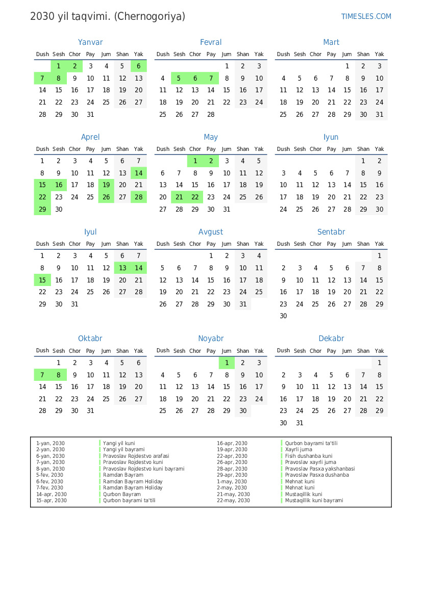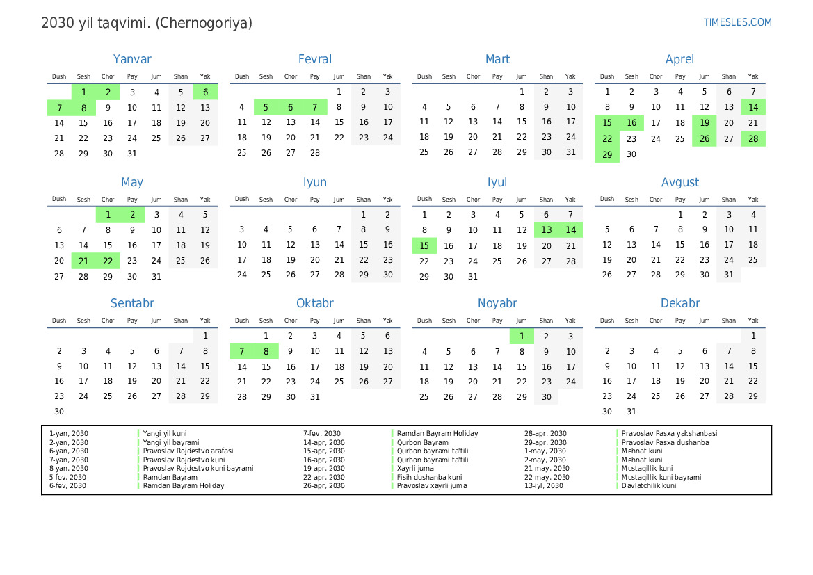 29-apr, 2030 Pravoslav Pasxa dushanba