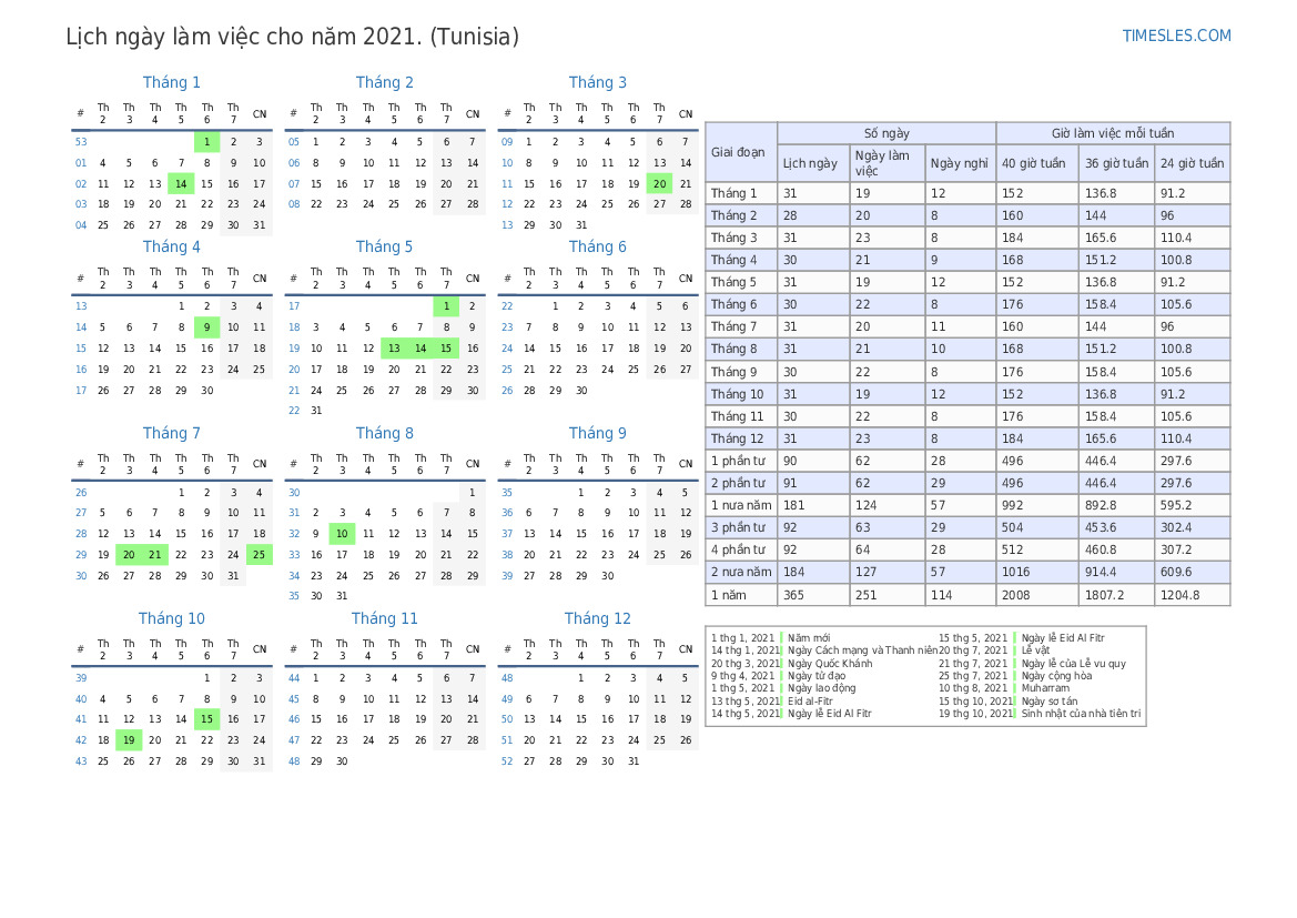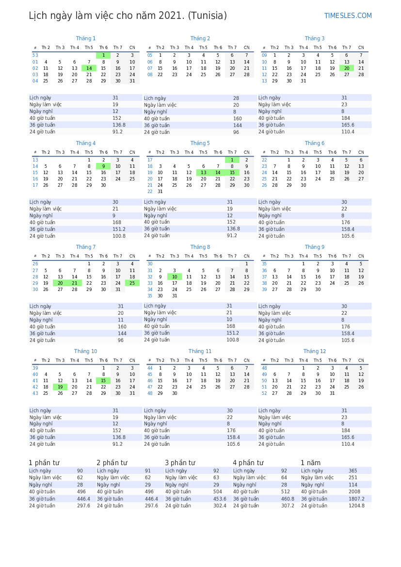 Lịch ngày làm việc Tháng 4 năm 2021 cho Tunisia