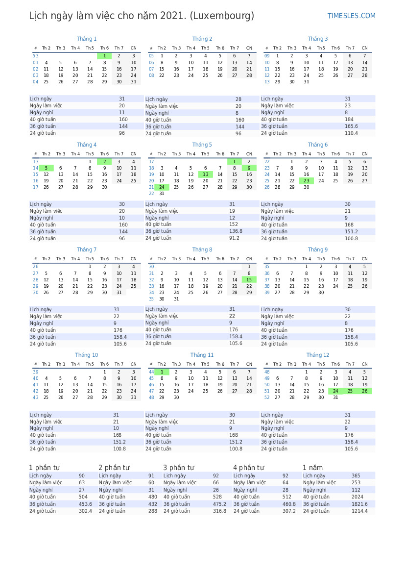 Lịch ngày làm việc Tháng 7 năm 2021 cho Luxembourg