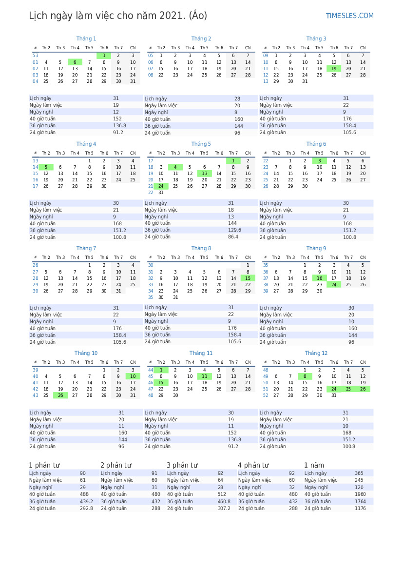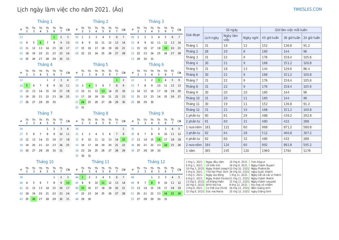 Lịch ngày làm việc Tháng 12 năm 2021 cho Áo