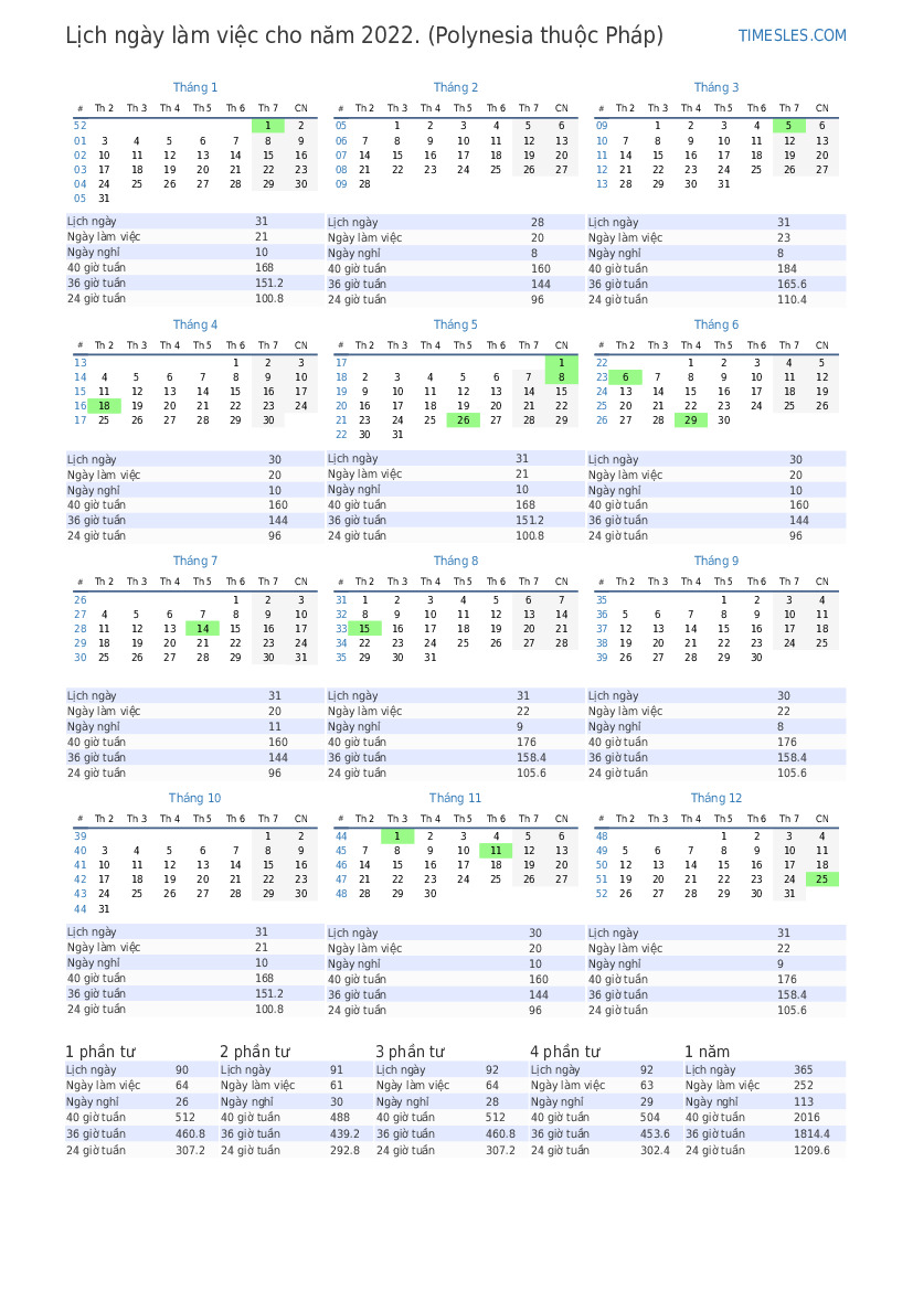 Lịch ngày làm việc Tháng 11 năm 2022 cho Polynesia thuộc Pháp