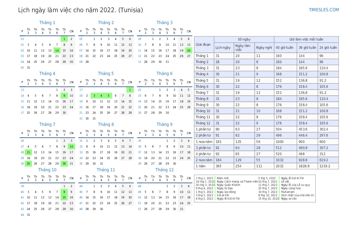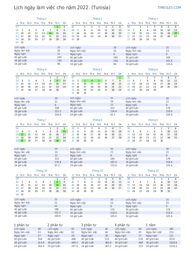 Lịch ngày làm việc Tháng 12 năm 2022 cho Tunisia
