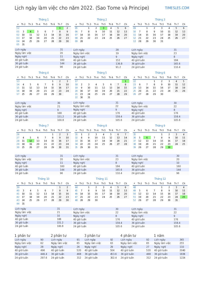 Trong quý 4 năm 2022, có 2 ngày nghỉ và ngày nghỉ ở Sao Tome và Principe. Quý 4 năm 2022 bắt đầu từ vào thứ bảy và kết thúc vào vào thứ bảy.