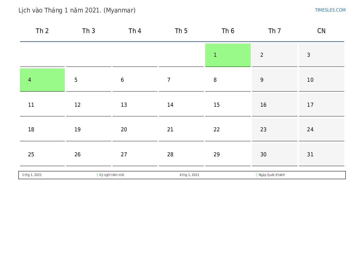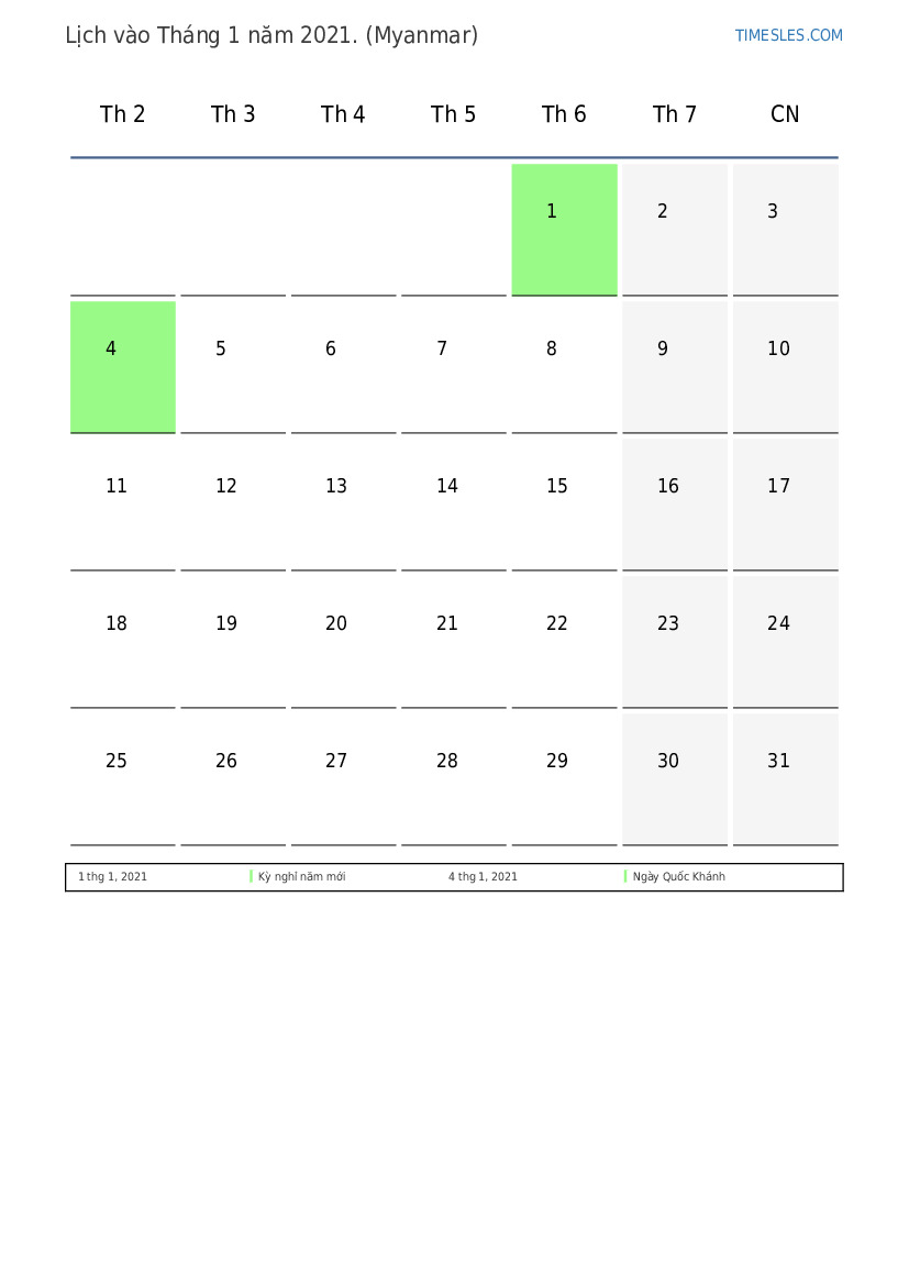 Tải xuống và in lịch PDF với các ngày lễ và cuối tuần vào Tháng 1 năm 2021 cho Myanmar