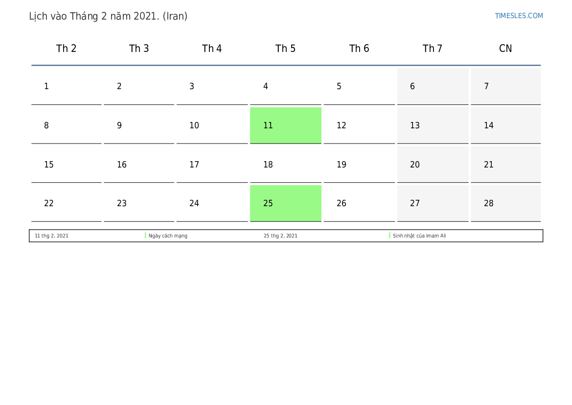 Tải xuống và in lịch PDF với các ngày lễ và cuối tuần vào Tháng 2 năm 2021 cho Iran
