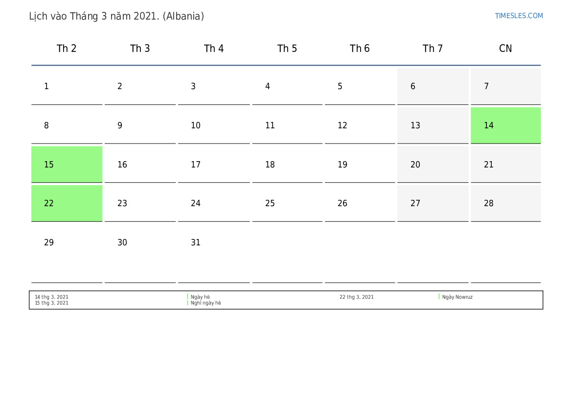 Tải xuống và in lịch PDF với các ngày lễ và cuối tuần vào Tháng 3 năm 2021 cho Albania