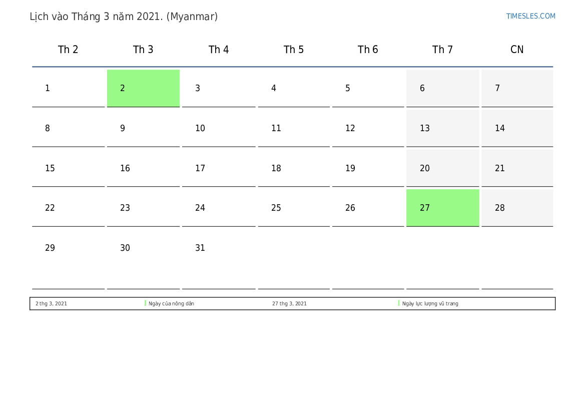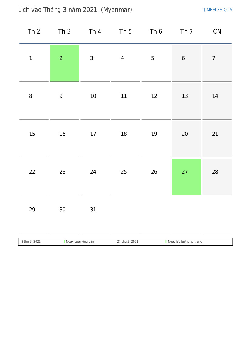 Tải xuống và in lịch PDF với các ngày lễ và cuối tuần vào Tháng 3 năm 2021 cho Myanmar
