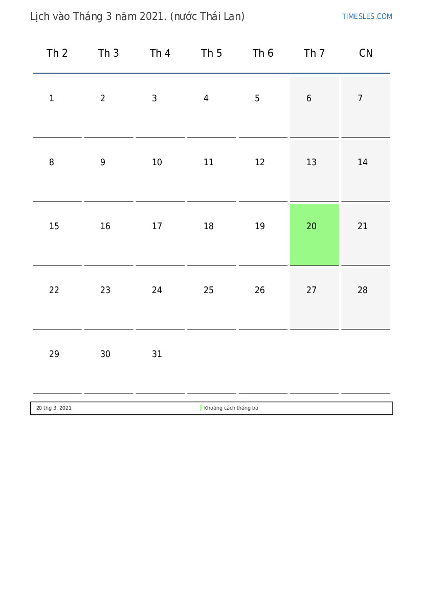 Tải xuống và in lịch PDF với các ngày lễ và cuối tuần vào Tháng 3 năm 2021 cho Thái Lan