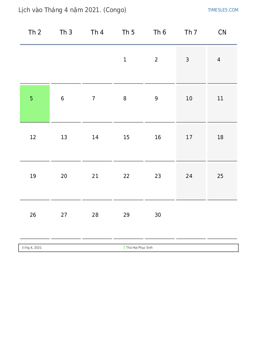 Tải xuống và in lịch PDF với các ngày lễ và cuối tuần vào Tháng 4 năm 2021 cho Congo