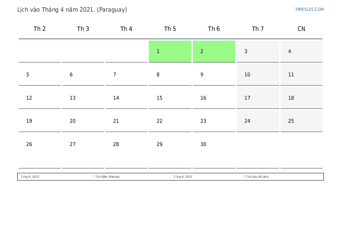 Tải xuống và in lịch PDF với các ngày lễ và cuối tuần vào Tháng 4 năm 2021 cho Paraguay